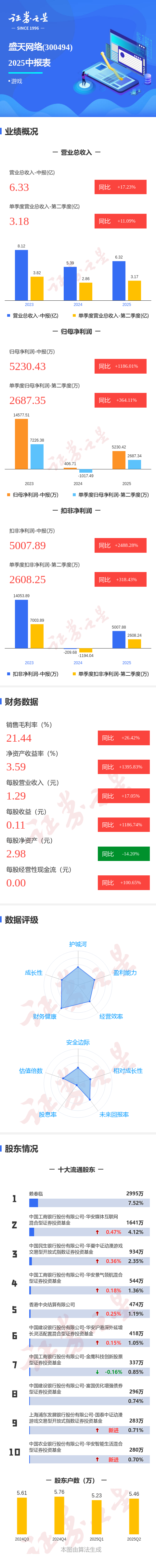 证券之星讯息,盛天集聚2025年中报泄露,公司主营收入6.33亿元,同比高涨17.23%;归母净利润5230.43万元,同比高涨1186.02%;扣非净利润5007.89万元,同比高涨2488.28%;其中2025年第二季度,公司单季度主营收入3.18亿元,同比高涨11.09%;单季度归母净利润2687.35万元,同比高涨364.11%;单季度扣非净利润2608.25万元,同比高涨318.44%;欠债率10.1%,投资收益77.46万元,财务用度-438.66万元,毛利率21.44%。 财报数