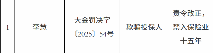 11月18日,国度金融监督处分总局大连监管局行政处罚信息公开表显现,李某因骗取投保东谈主被责令改正,禁入保障业十五年。